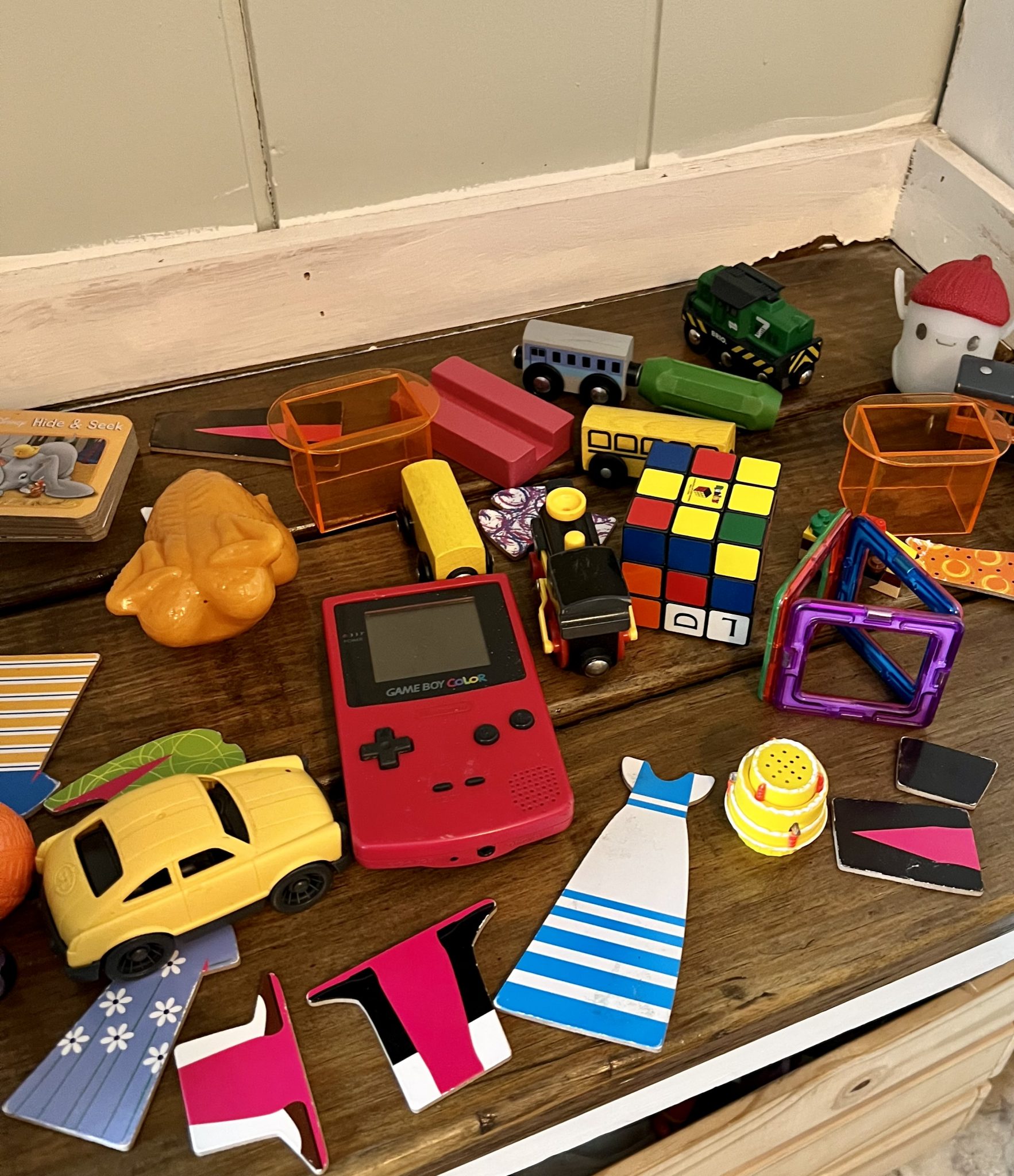 This is Catherine’s (3) current collection of items. Things are taken as “needed”, items rotate in and out, some get taken in bags to Grandma’s house, etc. We’ve got a whole chicken in there, so she’s doing some cooking. There are a few STEM items, which is nice to see. We’ve never owned a Game Boy Color, but I guess we do now. Is that how this works?