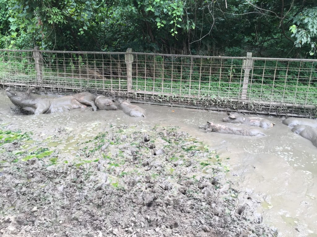 Pigs at the park. It was 100 degrees. We had the place to ourselves. That green stuff really looked like something straight out of Ghostbusters.